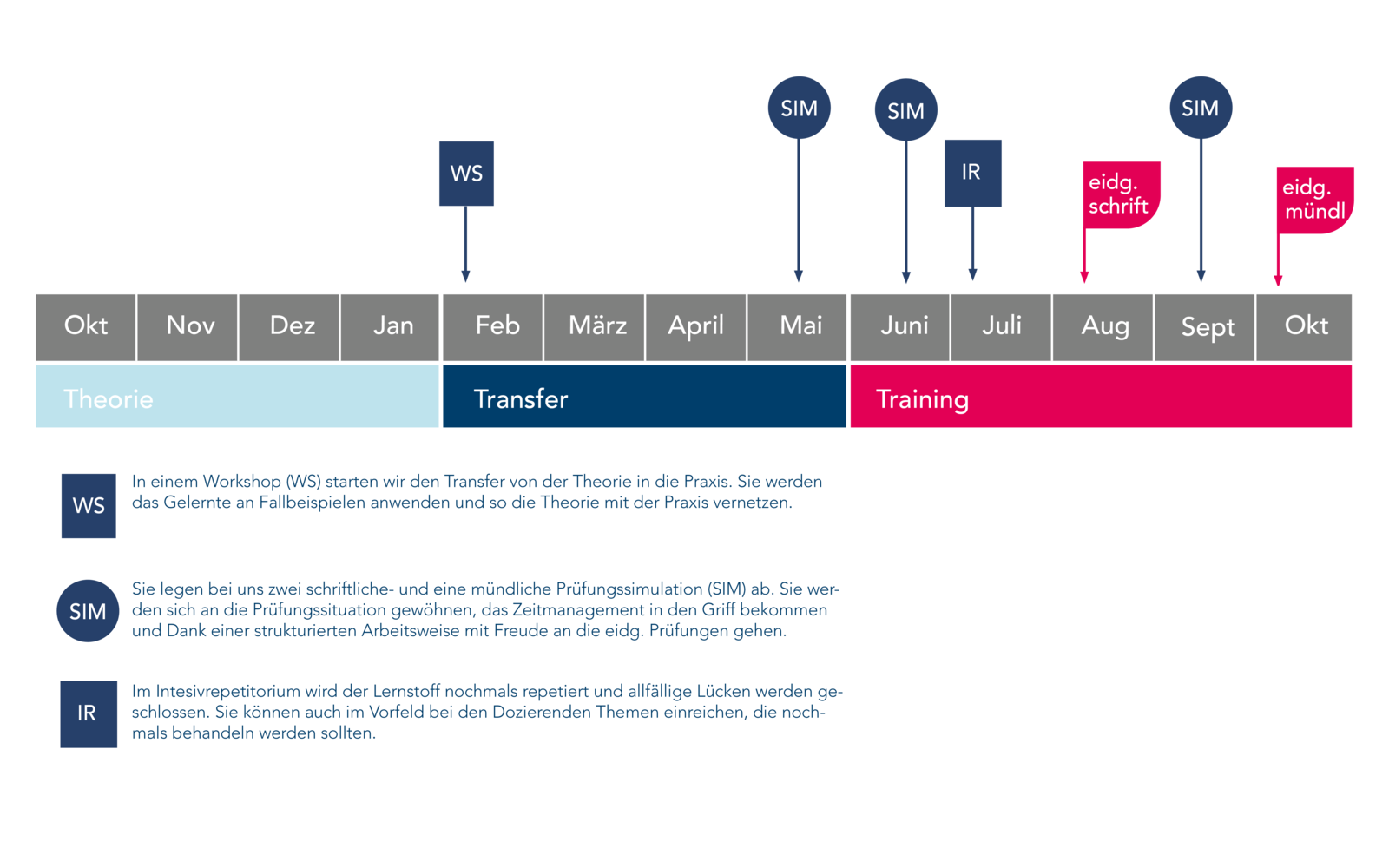 Das innovative Ausbildungskonzept garantiert Ihnen die bestmögliche Vorbereitung auf die eidg. Prüfungen. Sie benötigen keine Vorkurse oder dergleichen - ein duchgehender Bildungsgang - alles aus einem Guss.