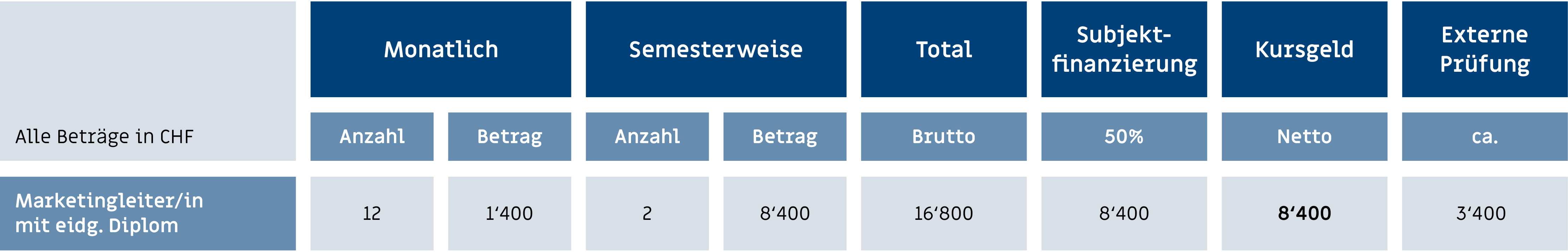 Unser Ziel ist ein möglichst effizienter Unterricht. Aus diesem Grunde setzen wir für Ausbildung als Marketingleiter/in zusätzlich zu den Zulassungsbedingungen der eidg. Prüfungskommission eine geeignete Grundbildung für den Unterricht voraus. Dies können sein: