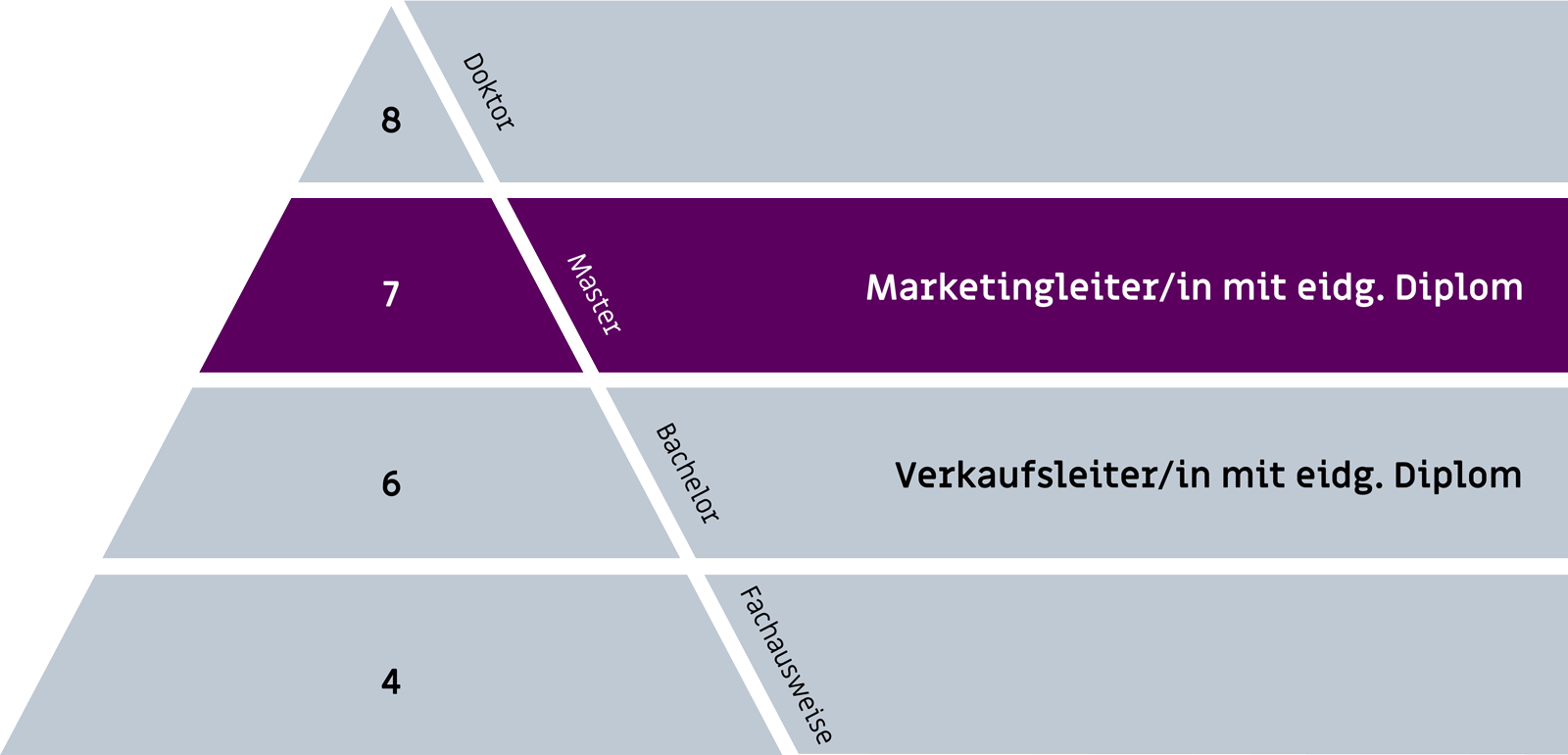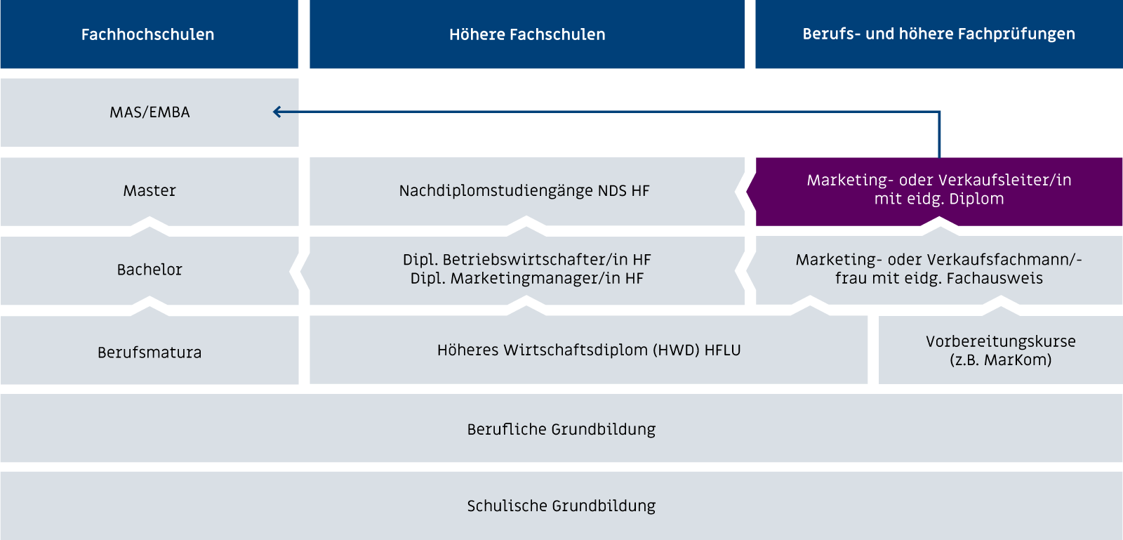 Mit dem Titel Marketingleiter/in mit eidg. Diplom sind Sie eine ausgewiesene Fachkraft. Sie sind befähigt eine leitende Postition in den Bereichen Marketing, Verkauf oder Kommunikation selbstständig zu übernehmen. Mehr zum möglichen Gehalt und Lohn als Marketingleiter/in findest Du hier. Die Ausbildung als Marketingleiter/in mit eidg. Diplom bildet eine optimale Basis für weiterführende Weiterbildungen.