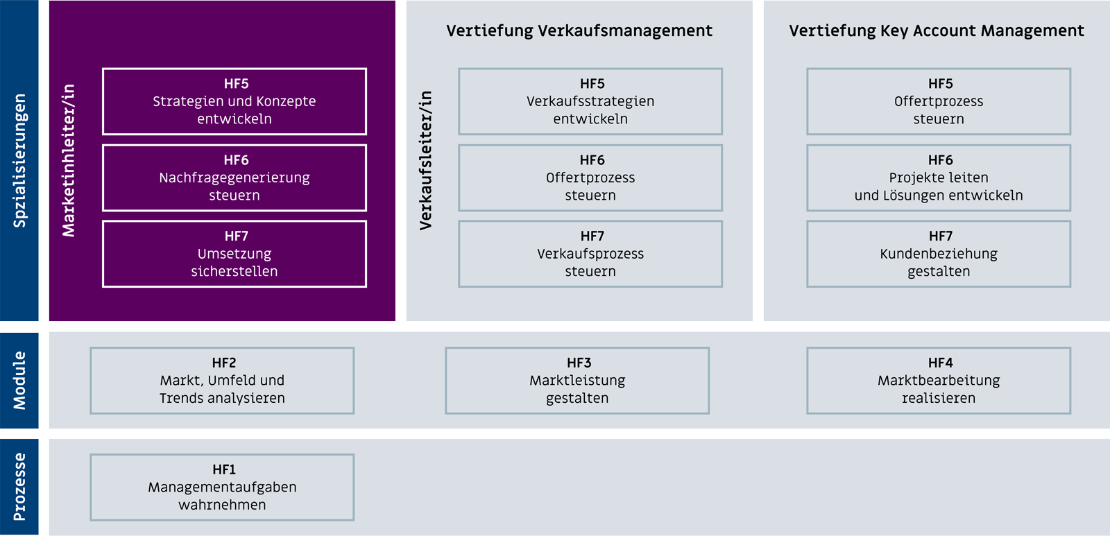 Die Marketing- und Verkaufsleiter/innen werden in 7 Handlungsfeldern geprüft. Die Handlungsfelder HF 1 bis und mit HF 4 werden von den Marketing- wie auch von den Verkaufsleiter/innen abgelegt und bilden die Grundlage. In den Handlungsfelder HF 5 bis und mit HF 7 findet die Spezialisierung statt.