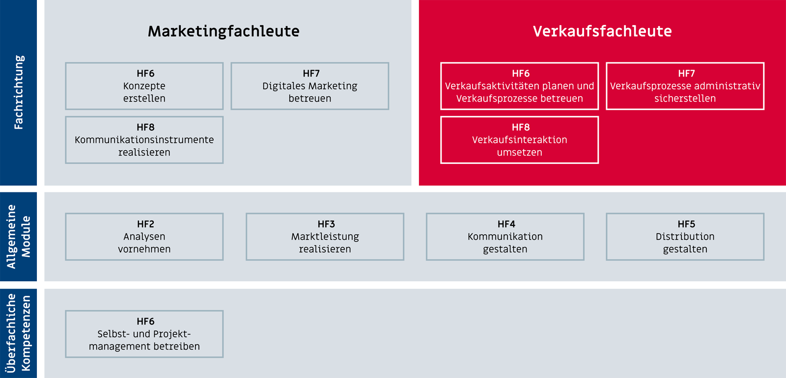 Die Marketingfachleute werden in 8 Handlungsfeldern geprüft. Die Handlungsfelder HF 1 bis und mit HF 5 werden von den Marketing- wie auch von den Verkaufsfachleuten abgelegt und bilden die Grundlage. In den Handlungsfelder HF 6 bis und mit HF 8 findet die Spezialisierung statt.